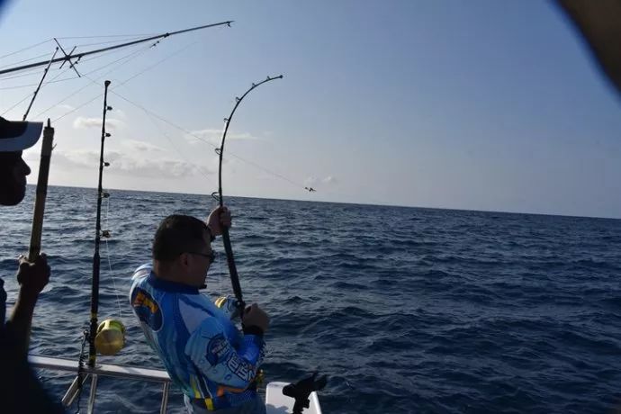 第一天上午他们钓了一条小的黄鳍金枪鱼和几条鲫鱼。 每次鱼上钩不是一条而已,是两三条一起上钩!