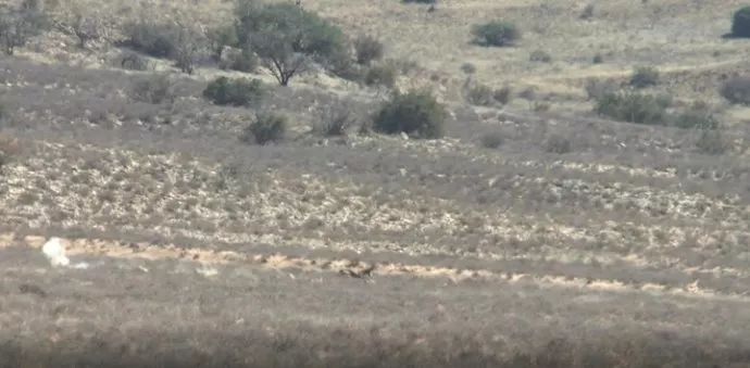 下午继续出发打猎。坐在狩猎车翻过山顶的时候看到了一群6只公黇鹿在对面山的峰顶,离他们320米。