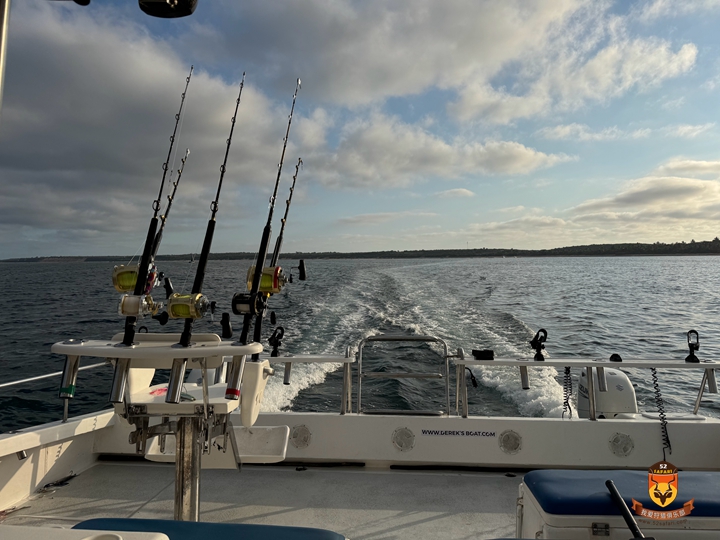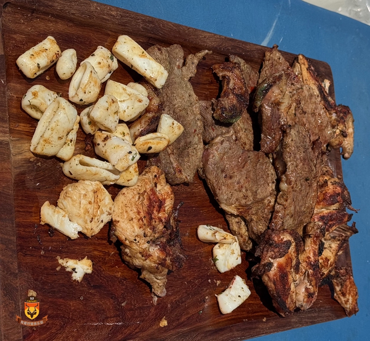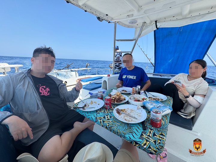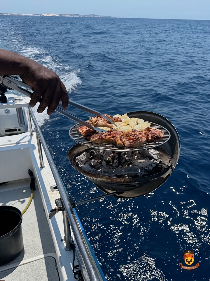第一天船上烤了新鲜马鲛鱼,第二天则烤了海狼,还搭配了鱿鱼、牛排和鸡肉——船上的午餐简直棒极了!