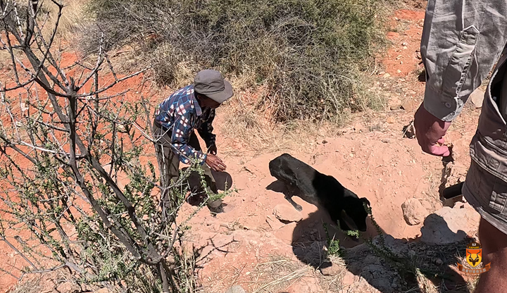 职业猎人表示附近住着一位养猎犬的居民,或许能帮我们把疣猪从洞里弄出来。我们驱车找到那位居民,他带着一只精瘦的黑狗前来相助。回到洞穴放出猎犬,它立即钻入洞中,深处传来犬吠声。