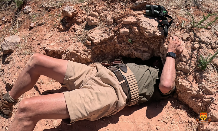 放弃追踪大羚羊后,我注意到远处山脚下有两只疣猪正在草丛中觅食。一位猎手决定尝试射击,我们便徒步靠近。在距离约150米处,他开枪击中疣猪腹部。受伤的疣猪窜入山谷消失不见,我们循着血迹追踪400米后,发现它钻进了干涸河床岩壁上的深洞。洞穴先是笔直深入岩壁,随后呈90度向左转弯。