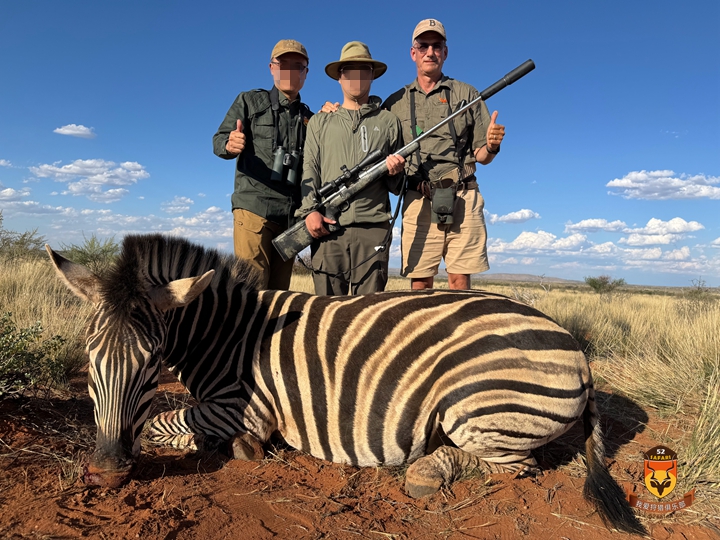 一位猎手想猎取斑马。虽然牧场里斑马数量众多,但它们常居山岭且对车辆声响极其敏感,因此成为最难狩猎的物种之一,通常需要徒步上山追猎。连续数日我们多次进山搜寻却一无所获,直到某次驾车时意外发现远处尚未察觉我们的斑马群。我们下车潜行数百米拉近距离,在300米外打出漂亮一枪,成功猎获一匹美丽的斑马!