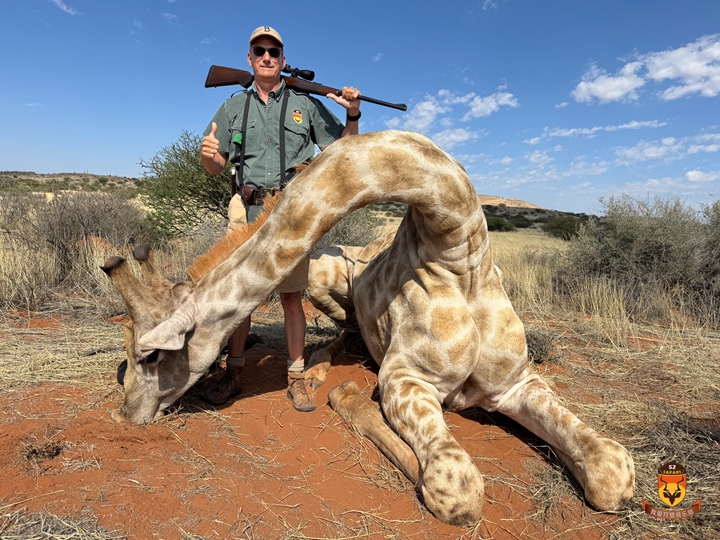 另一位猎手计划狩猎长颈鹿。这项工作最好在清晨进行,因为将长颈鹿运回营地并处理需要耗费大量时间和人力。某日清晨我们出发不久就发现大型长颈鹿群。根据牧场管理计划,需要淘汰部分年轻雄性长颈鹿,我们选定目标后徒步靠近。猎手连开三枪,长颈鹿应声倒地!