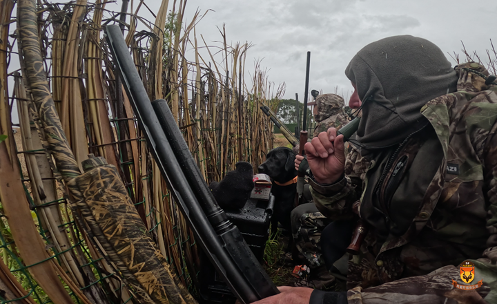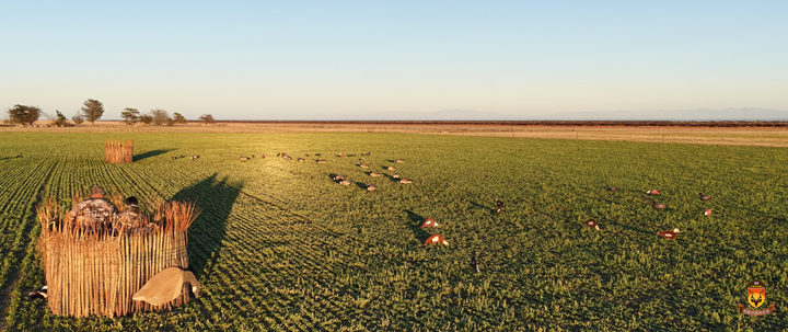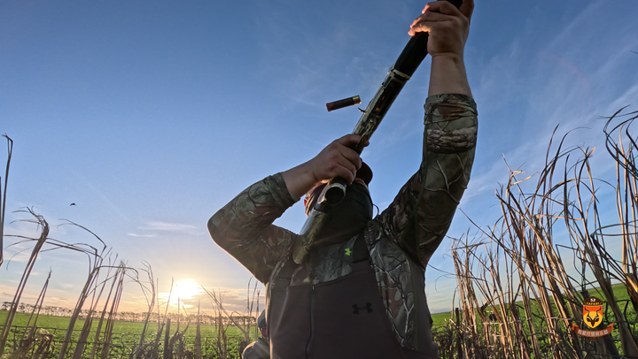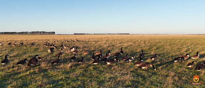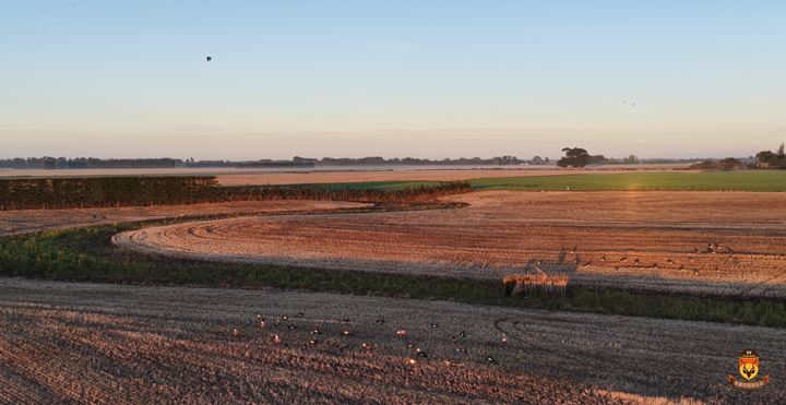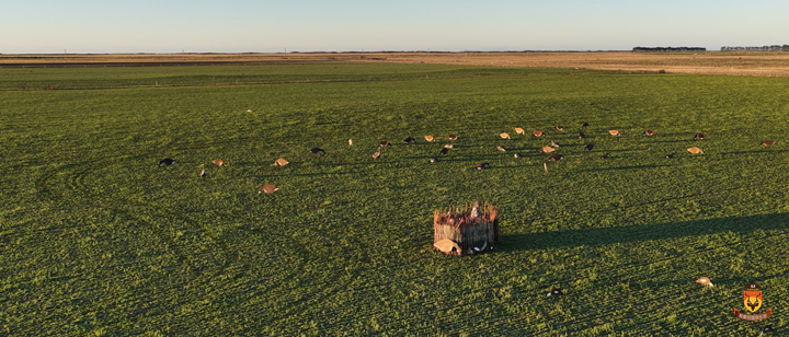 我们狩猎之旅的最后一天,回到了那片我们曾在雨中射击的大麦田,然而这日破晓,阳光明媚,风平浪静。我们抵达时,Jelly 的车还停在隐蔽点旁,天堂鸭便开始飞来了。我抓起枪,在客户们还没来得及装填弹药时,便已双发连中,打下两只。这为全天定下了基调。战况虽不及雨天那般疯狂,却稳定而令人满足——鸭群和雁群一波波飞来,为我们这四天的水禽狩猎之旅画上了完美的句号。