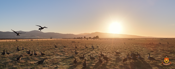 那天下午,Jelly 领着我们来到一片刚收割不久的大麦田,距离住处仅二十分钟车程。当我们驶近时,数百只鸭和雁如落叶般散布在田野上,啄食着散落的谷粒。在我们靠近隐蔽点时惊飞了它们——顿时一片震耳的振翅声——随后我们把车停到远处。这时,雨开始落下,不是绵绵细雨,而是地地道道的新西兰倾盆大雨。